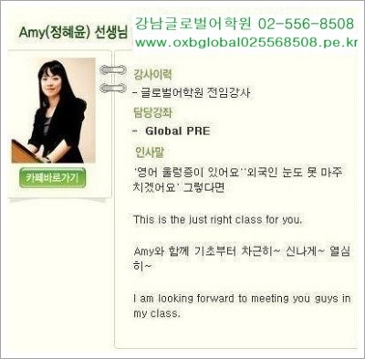 서울특별시 강남구 역삼1동 위치, 기초영어회화학원, 프로그램안내, 초보, 어학연수, 유학정보 제공. 왕기초영어/초보영어/기초영어/영어기초/초보영어/왕초보영어/영어왕기초 강남글로벌어학원☎공이-오오륙-팔오공팔 글로발문화원 강남글로벌어학원 ^여러분의 마지막 영어공부법^^ 영어초보자! 나이에 상관없이 영어공부 어떻게 다시 시작해야할지 망설이시는 분들께 전해드리는 영어학습법이 되실겁니다.-중고등학교때 배워왔던 암기식의 영어공부^^를 토대로 영어말하기에 도전을 원하신다면 명심하시길 바랍니다!!!!왕초보분들이 다시작해도 귀가 열리고 말문이 트일수 있는 왕기초영어학원 제공:글로발문화원/강남글로벌어학원 교육상담부 @영어공부 시작하기전에 지켜야할 나의 자세@#.영어는어렵다는것을 인정하세요.#.영어에 대한 울렁증! 두려움을 극복하세요.#.심리적 부담은 어느정도 가지세요.@#영어공부 시작하기전에 기본적으로 갖추어야 할일 @#★영어공부 하는데 있어서 실천가능하고 구체적인 목표를 세우세요.★나한테 맞는 영어공부 학습방법을 제대로 고르세요.★체계적인 영어교재와 영어학원을 고르세요.%영어공부 시작하기전에 반드시 지켜야할 영어공부규칙% $나의 목적에 맞는 영어공부를 하세요. $항상 영어식으로 생각하는 법을 기르세요 $생생한 영어문장을 외우세요. $반복,훈련영어공부는 노트정리로 마무리하세요. $영어회화 표현을 많이 익히세요. $매일 정해진 영어학습시간을 반드시 채우세요. $영어표현을 자주 사용하세요. $영어공부 중간중간 확인을 해보세요. ^^고객님의 마지막 기초영어학원이 되어 드리는곳!!!!! 왕기초영어학원 &강남글로벌어학원 http://www.oxbglobal025568508.pe.kr