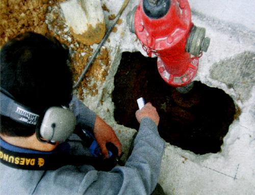 주택, 아파트, 상가건축물, 수도관, 난방관, 소화전, 온수관 누수탐지 전문업체. 누수탐지의 원리.일반적으로 파이프에서 누수가 발생할때 관에서는 파열음이 발생된다. 이것을 통상 누수음이라 한다. 그런데 이 누수 음은 지하에 매몰된 관에서 발생됨으로 지상에서는 가청할수 없다.따라서 누수탐지기로 지상에서 가청할수있게 누수음을 변환시키 누수지점을 찿는다.누수탐지작업1)현장파악: 누수탐지기는 파이프에서 누수가 될때 나오는 파열을 듣는원리를 이용하므로누 수가 발생될경우 배관에의한 누수인지 기타 다른요인에 의한 누수인가를 먼저 파악해야한다.2)배관의 선택: 어느배관에서 누수가 발생되나 먼저 파악한다 예를들면 옥내일 경우는 난방 온수 냉수 중 하나를 선택한다.3)센서선택: 탐사작업자는 주의환경을 잘살펴보고 목표 선에 빨리도달할수 있는 탐지기의센서를 어떤것을 사용할것인가 결정한다.4)관로탐사: 센서를 관로위를 지나가면서 탐사해야 보다 효율적이기 때문에 관로탐사가 이루어져야 한다.5)준비작업: 본체에 헤드폰을 꽂고 연결콘네트를 연결한다. 그리고 파이프의 위치를 알수있는 관망도등의 기초적인 도면을 참조한다.