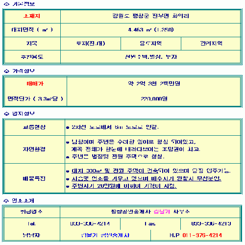 평창군 진부면 위치, 토지, 임야, 펜션, 전원 및 농가주택 중개, 상담 안내. 안녕하십니까?저희 홈페이지에 방문하시면 고객님들을 위한 보다 많은 분량의 넓은 물권의 사진과 상세한 성명이 기재 되어 있습니다.평창 공인중개사 김을기 사무소에 오신것을 환영합니다.저희 사무소에서는 강원도를 중점으로 하여 용평면, 진부면, 도암면 등 그 외 정선, 삼척까지 넓은 물권을 선점하고 있습니다.정확한 시세분석과 신뢰있는 업무처리로 안전한 부동산 거래를 지향하고 있으며, 고객만족과 정직, 신뢰를 우선으로 하여 고객님의 소중한 재산을 책임중개 해 나가겠습니다.작은 궁금점이라도 전화주시면, 정확한 정보로 친절히 상담해 드리겠습니다.언제든 전화 주세요.